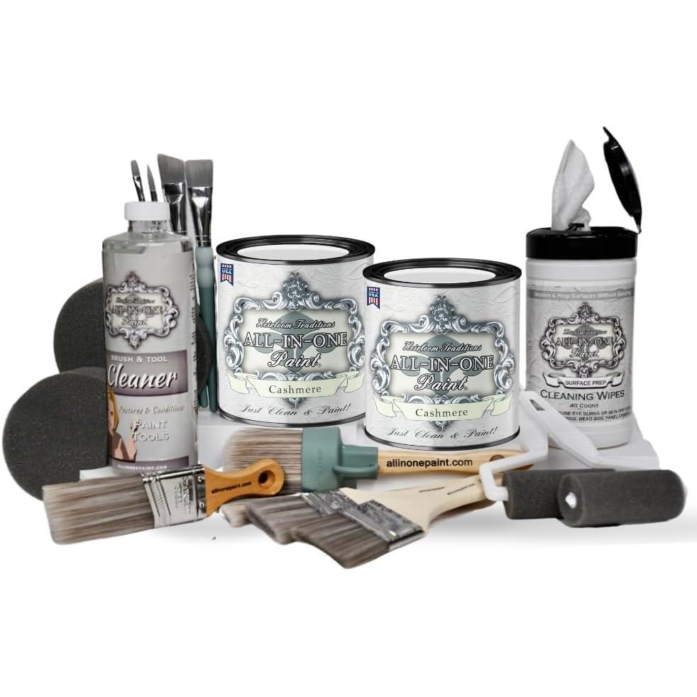 Cabinet refinishing kit includes 2-32oz paint (average coverage – 280 sq ft), 1-40ct deglosser wipes, 1 brush & tool cleaner and tool trio (2 true applicator, 2 roller and 1 syntec oval brush) plus our 8 piece brush bundle (3 syntec chip brushes, 1 angled trim brush and 4 pc. detail brush pack)